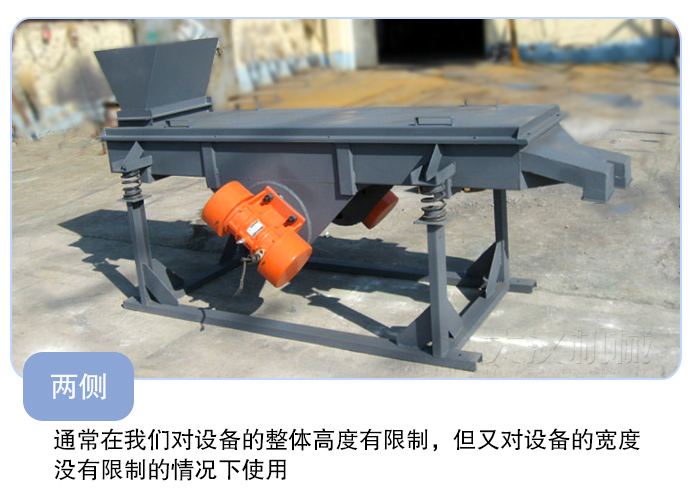 這種安裝方式也是直線振動篩設備振動電機較為采用的方法。通常在我們對設備的整體高度有限制,但又對設備的寬度沒有限制的情況下使用。比如因為一些物料的特殊要求,設備的出料口不能離地太高啦,在這種情況我們如果吧振動電機安裝在直線篩的底部或者頂部,那么設備的整體高度就不好控制了。一般來說直線篩的篩箱的高度通常是一定的,所以我們不能對篩箱的高度做調整,這是就可以考慮將振動電機安裝在直線篩的兩側,這樣可以大大的降低設備的整體高度,又不影響設備的工作效率。