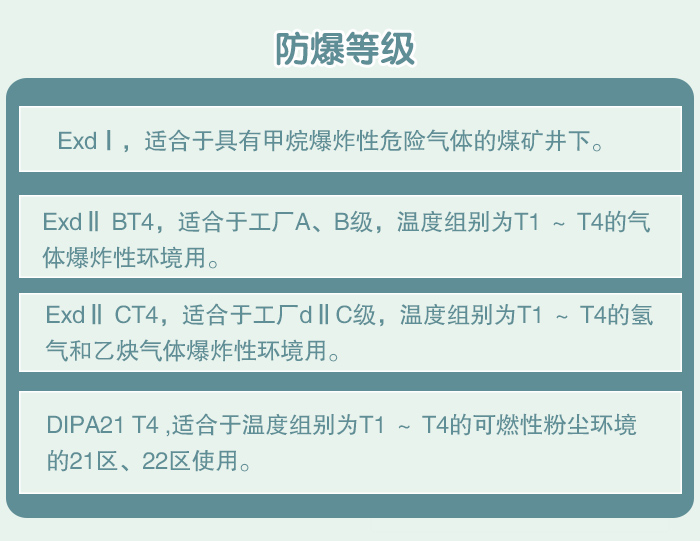 防爆標志為ExdⅡ BT4,適合于工廠A、B級,溫度組別為T1 ~ T4的氣體爆炸性環境用。