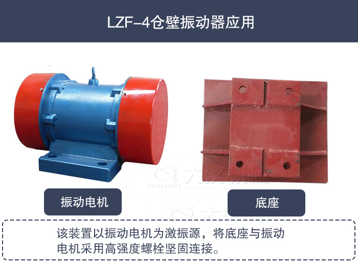 LZF-4倉壁振動器是應(yīng)用振動電機的一個典型實例。該裝置以振動電機為激振源,將底座與振動電機采用高強度螺栓堅固連接。